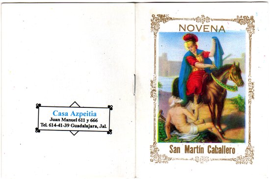 Notes:Novena* booklet. This novena contains nine sets of prayers; each set starts with an episode in the life of San Martín Caballero, featuring each event as a religious example; this follows with reflections that generally center in the idea of virtue. --- (*) Novenas are a very popular devotion in Mexico and Latin America in general. They consist of prayers said nine successive days, reciting the rosary. People usually gather in a neighbour's house, and the host reads the prayers from a novena booklet, which works both as guide for the steps to follow and as a prayers book. There are several types of novenas and types of requests associated to a religious character or topic in each booklet.